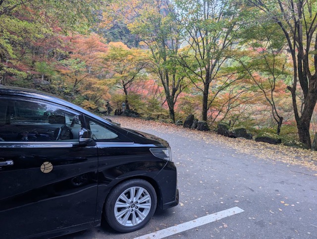 安居渓谷の水晶渕入口の駐車場も紅葉がとてもきれいです。写真は、本日ご案内中の当社アルファードです。 -